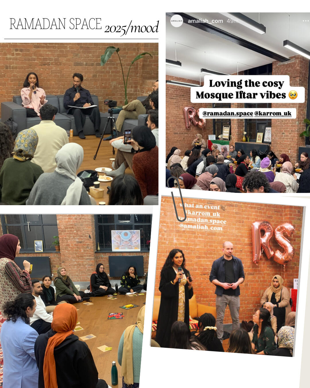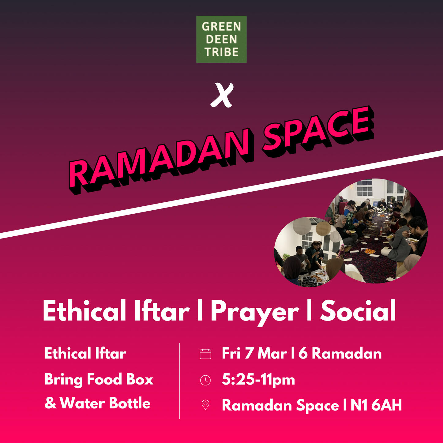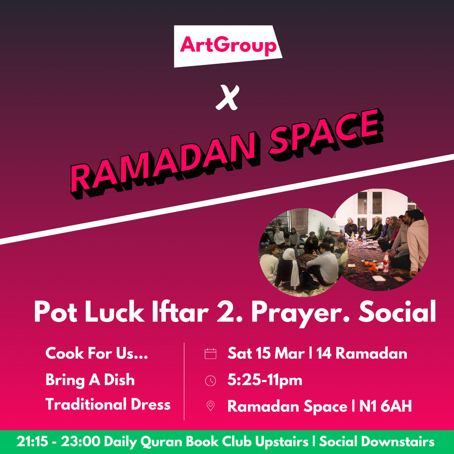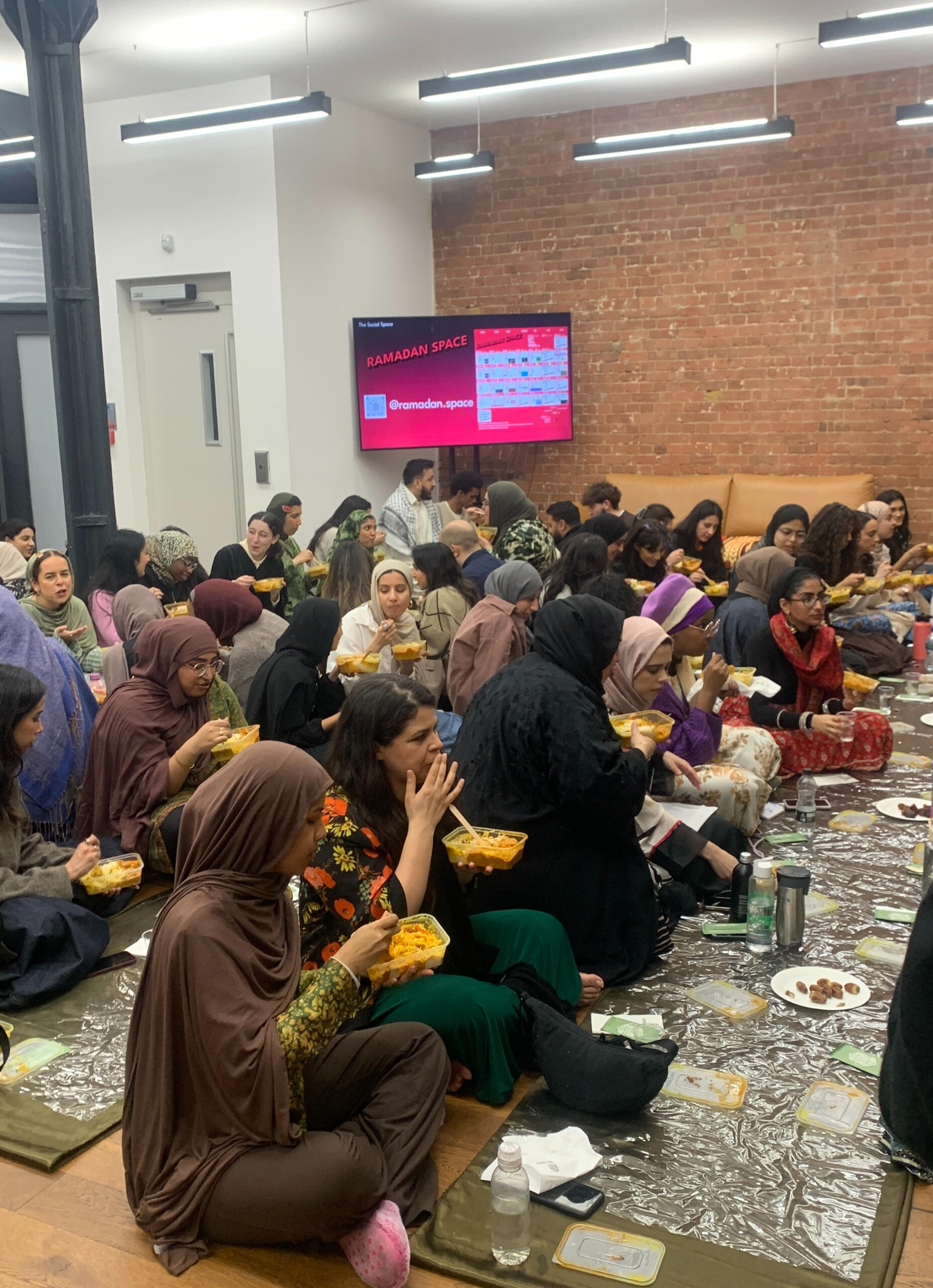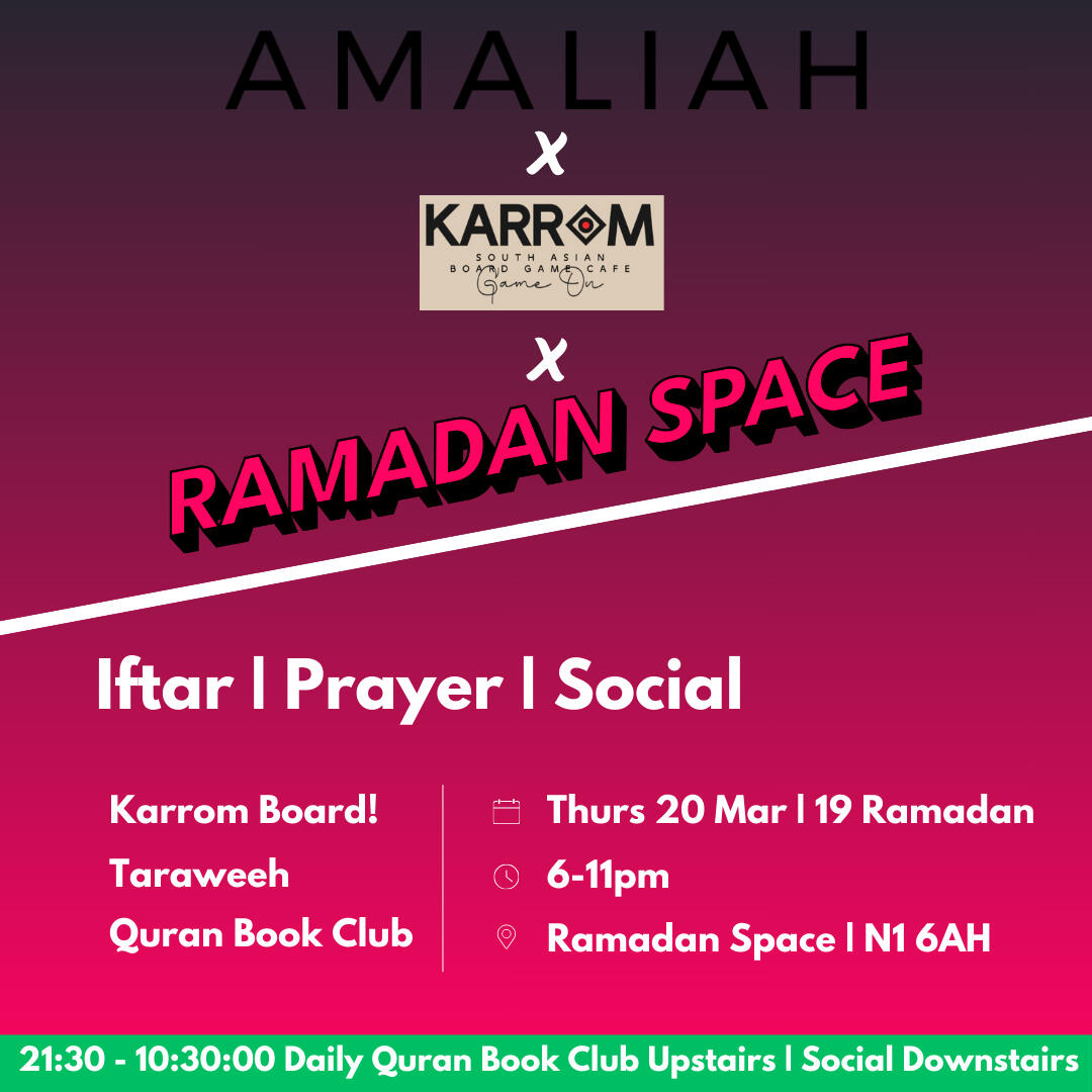 Where is Ramadan Space located?Ramadan Space is at 65-69 East Road, London N1 6AH.It is approximately a three minute walk from Old Street stationCan anyone attend?Yes. Everyone is welcome, including families with children, people of other faiths, and individuals who simply wish to experience the community atmosphereHow do I book a ticket for an Iftar evening?Visit the Ramadan Space website and choose the date you wish to attend.Each attendee must register to secure a place. Capacity is limited to 80 people per night, so early booking is recommended.What time are we supposed to get there and when does the session start?We open the doors about 15 minutes before iftar.We break fast with dates and water, pray, have dinner and then begin the programme at around 6:20pmWhat is the price of a ticket?The general ticket price is often around 5 pounds and some change, to cover processing fees.Special events or collaborations may cost slightly more. The specific price details for each event can be found on the website.How can I volunteer?There are several volunteer teams, including Kitchen Team, Set Up Team, Social Media Team, Programme Team, Ticketing and Registration Team, and more.If you wish to help, contact one of the admins via the WhatsApp chat or the website.What is a potluck event?A potluck is a gathering where each guest brings a dish to share.We coordinate the menu to ensure everyone can enjoy a variety of foods. If you have specific dietary requirements, please label your dish or mention it to the groupWhat happens to leftover food?In most cases, there is little surplus. Any remaining food is either shared with participants at the venue or distributed to those in need nearbyHow can I donate to support Ramadan Space?The entire project runs on donations to cover venue hire and meals.You can donate through the link provided on the Ramadan Space website.No amount is too small, and all contributions go directly towards running costs and Iftar expensesIs the space child friendly?Yes. Families with children are more than welcome. Children often add to the sense of community and joy at the Iftar gatherings.When does Ramadan Space open?The first Iftar will be on Sunday, 2 March, and events continue throughout the month.Keep checking the WhatsApp group or the Ramadan Space website for regular updates.Can we still attend without a ticket?Unfortunately no, it wouldn’t be fair to those who have already booked tickets.We may release more soon, so keep and eye on updates.Once the programme finishes, you’re welcome to join us for Tarawih prayers, socials & Quran Book Club.You can find Tarawih times further down in the FAQ.Is Ramadan Space open during the day? For co-working at all?No, it opens at 5:30. During the day other people are using it and that’s why we need to set up and remove all our stuff every day.I still have questions. How do I contact an admin?If your question is about volunteering or ticketing, feel free to mention one of the admins in the WhatsApp group.Is the venue accessible for those who cannot use stairs?The main event area is on the ground floor, but there is a short flight of stairs leading to another section.If you have any mobility concerns, please inform an admin in advance so we can offer assistance or make alternative arrangementsTarawihHow many rakats do we pray?We pray eight rakats every nightHow much of the Quran is being recited?We recite about half a juz each nightHow long does it take?About 1 hourWhat time is Isha and Tarawih?Sunday 2 March 8pm