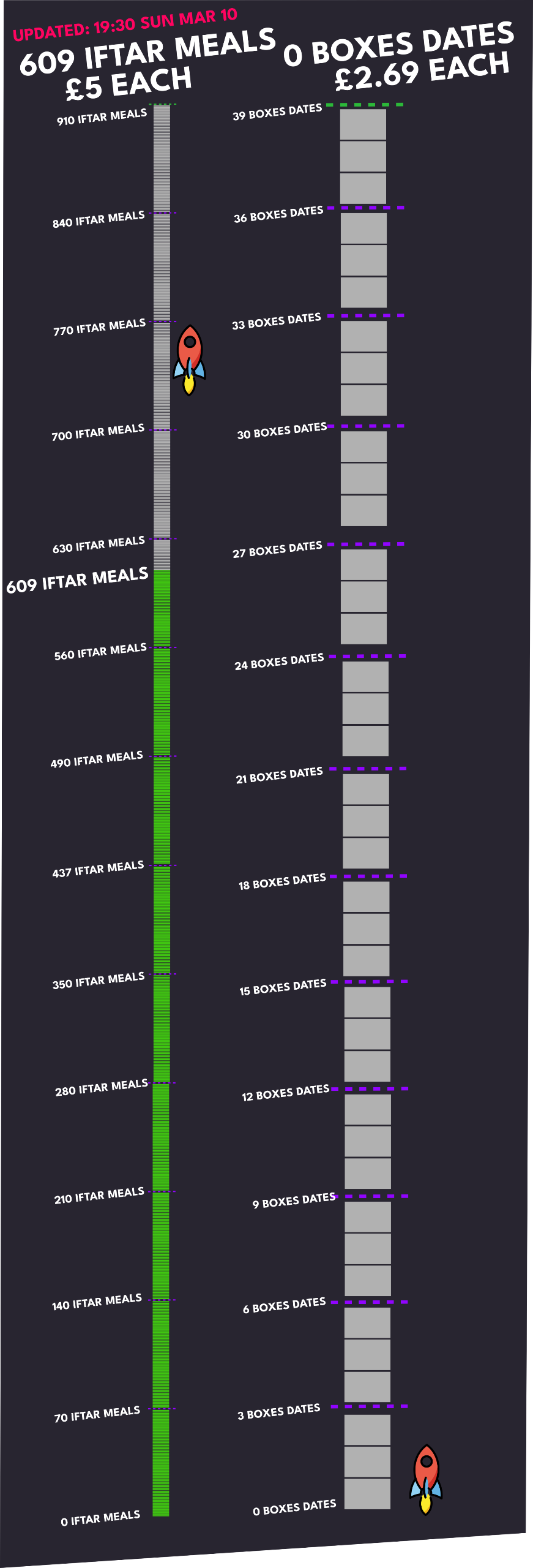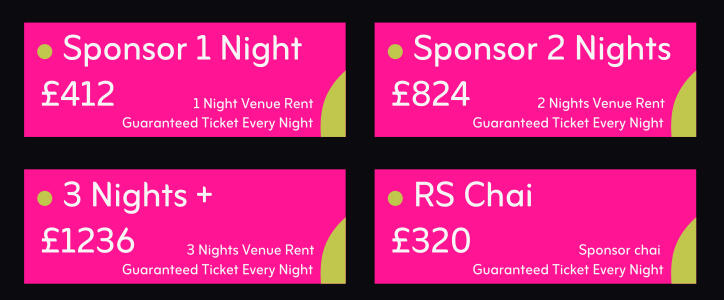 Support us by donating towards:Venue Fund | £19,000Project Expenses | £8000 (food deliveries, drinks, chai etc...)Volunteers & free iftars | £3000£22,500: Iftars/Food. 30 nights x100 people at £5/head. (Covered by tickets)2026 Ramadan Target £30,000.- - - - - - - -"It is a great initiative & has been fantastically executed." - Mahrukh
