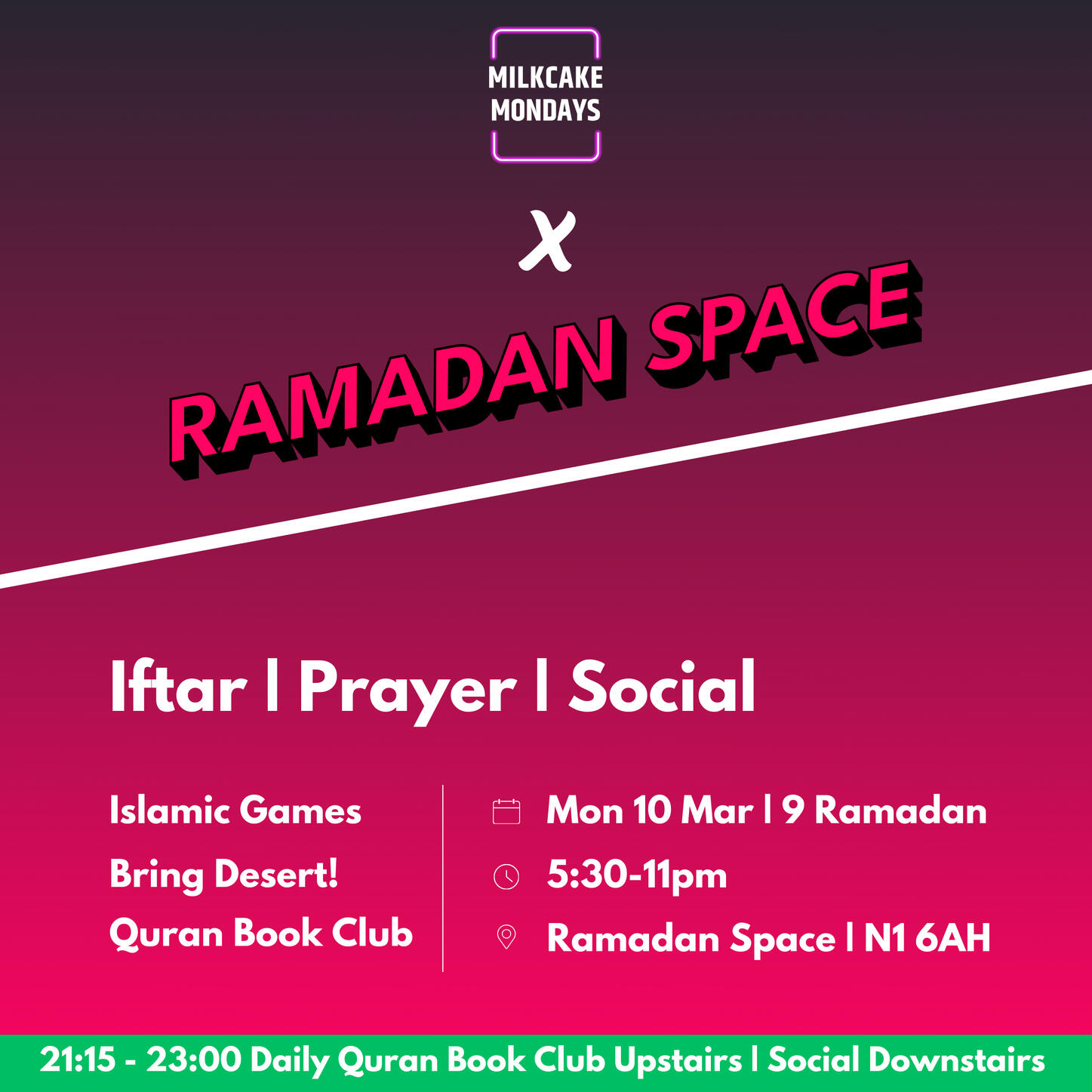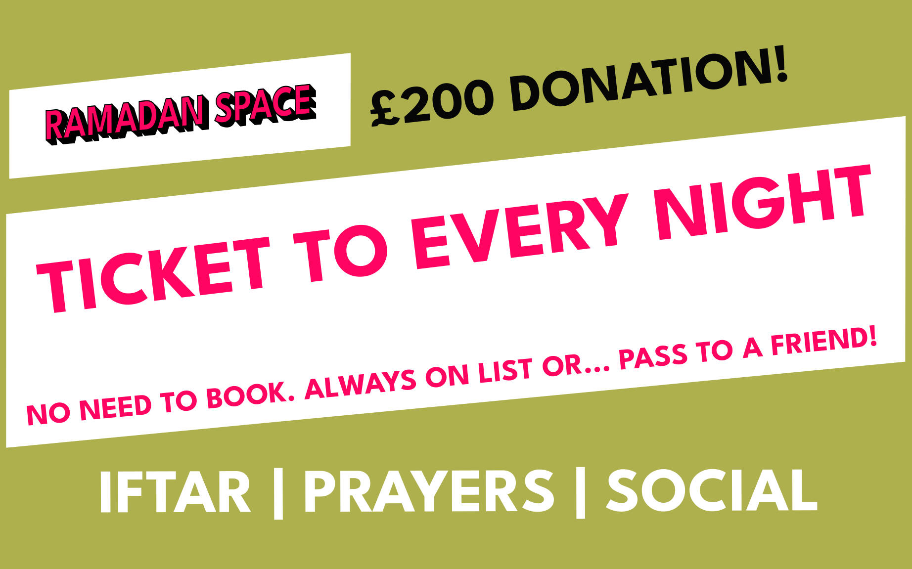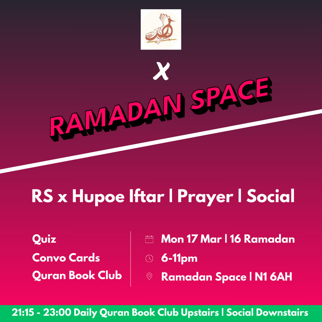 Ramadan Space is a pop up space in Shoreditch.A home & family to 100+ people/night in Ramadan. Many away from home/family.A space to deeply connect in a safe space for young professionals.More than iftar...Taraweeh.Events.Quran Book Clubs...Whole night till late.Quran book clubs, mocktail businesses & more have been incubated here!Help bring Ramadan Space 2026 to life...