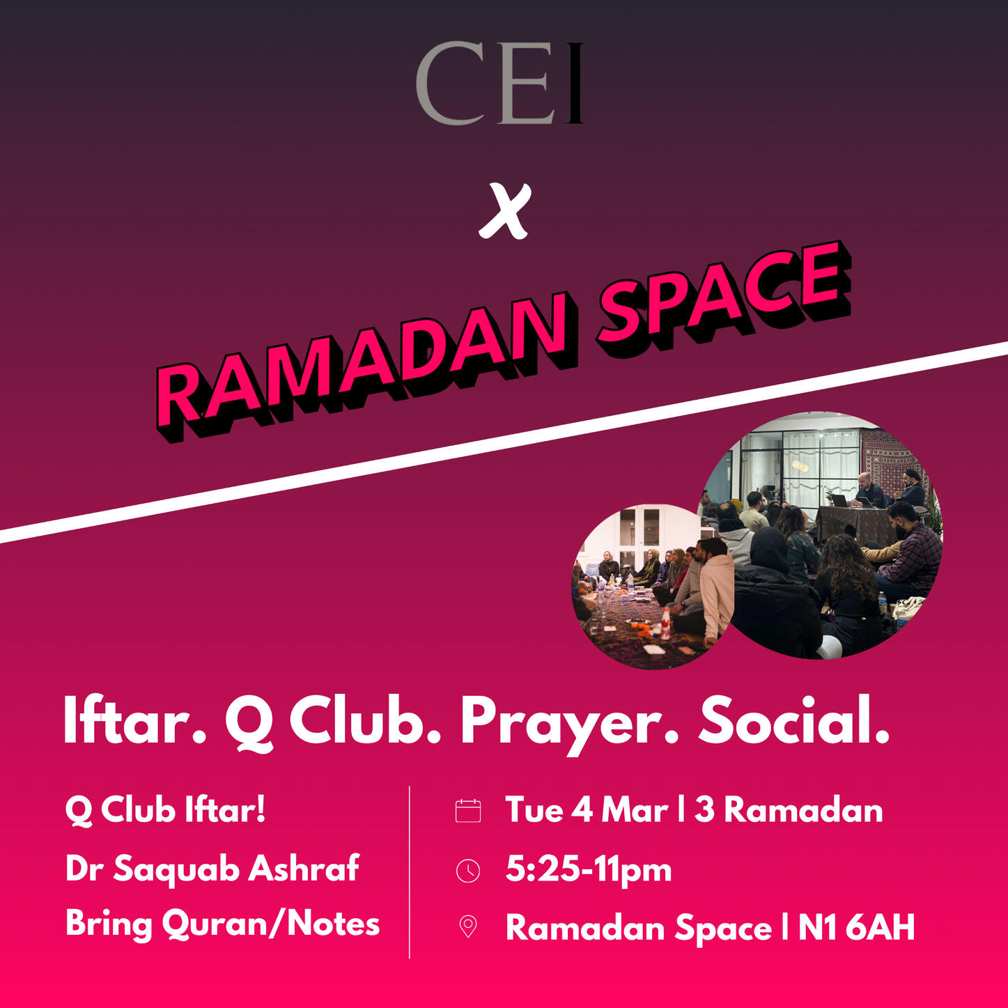 📕 Quran Reflections with Dr Saquab from CEI.Iftar. Q Club. Taraweeh. Social.