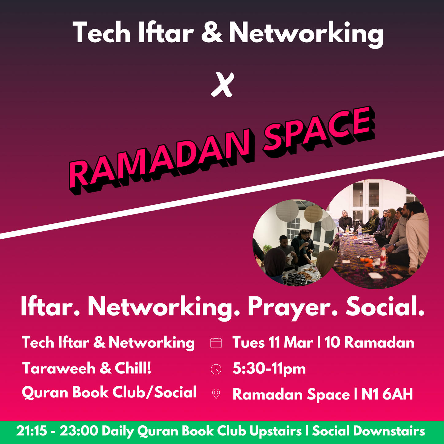 Networking iftar with Abdul-Rahman Pillars App founder...Ice breakers & a chance to meet tech founders & ask any questions you may have.Taraweeh prayer & followed by social downstairs & our optional daily Quran book club upstairs.(If want to add a donation to Ramadan Space click change amount)
