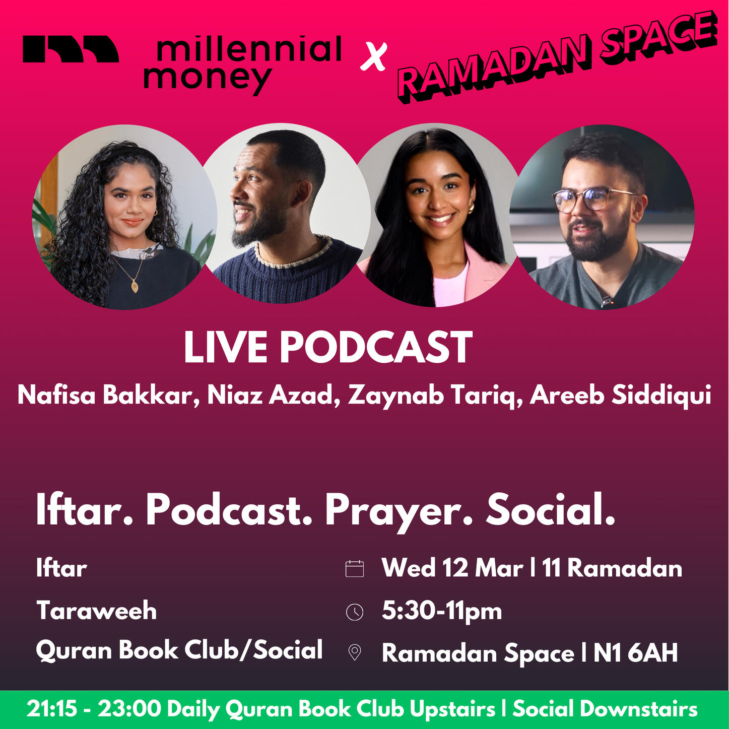 A live podcast at Ramadan Space :DFounder of Millenial Money, Niaz Azad meets Nafisa Bakkar, founder of Amaliah & Halal Gems & Zaynab Tariq founder of Cereal Box & Pushpa & Areeb Siddiqui founder of Kestrl.(If want to add a donation to Ramadan Space click change amount)