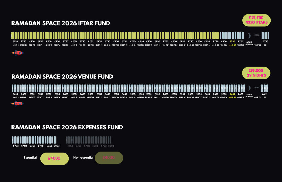 Want To Sponsor A Night At Ramadan Space?A space for iftars, taraweeh prayers, collaborations & and socials.Our budget is £5/Head.Sponsor a night | 100 Iftars | £500